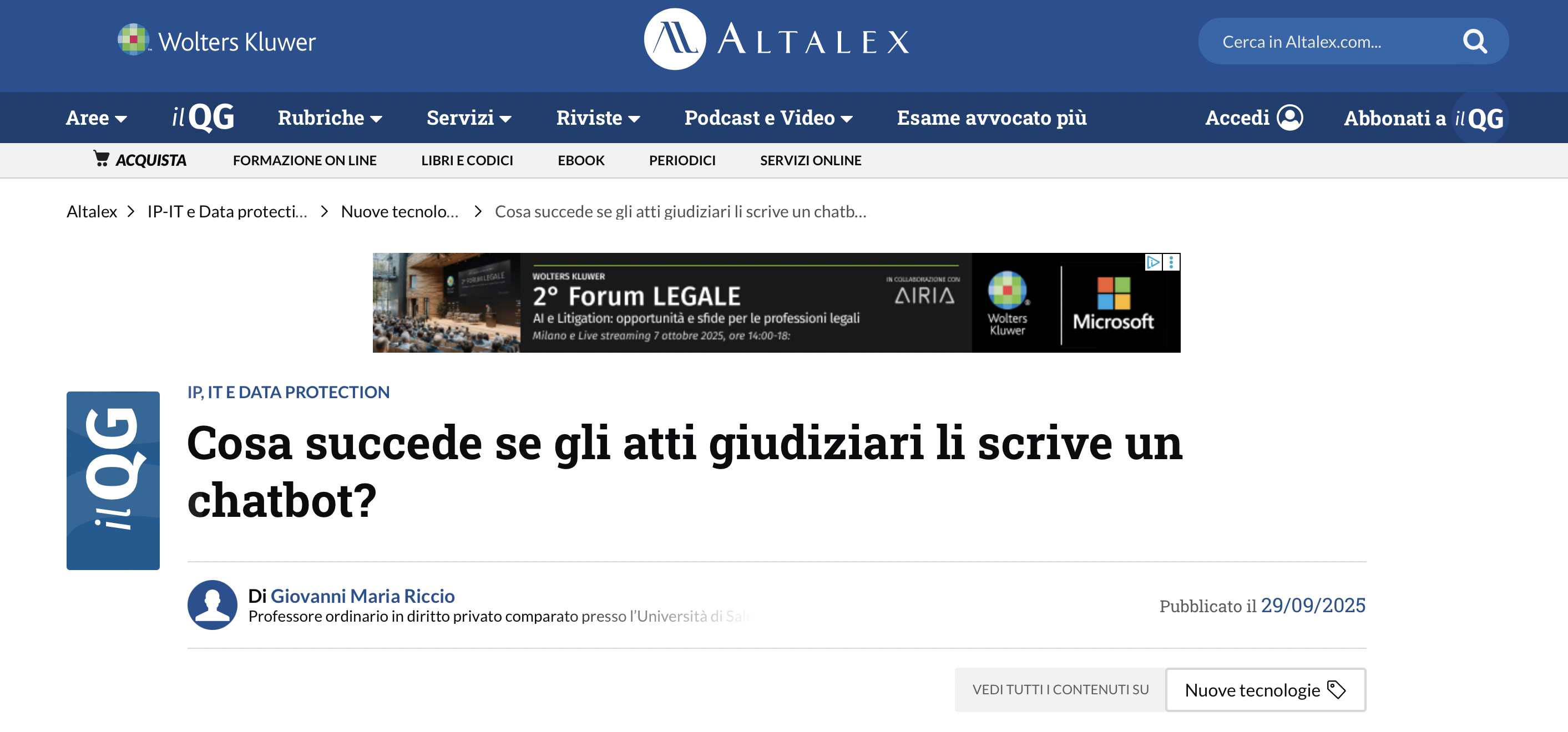 L’articolo, del prof. Giovanni Maria Riccio, è disponibile su Altalex: https://www.altalex.com/documents/2025/09/29/succede-atti-giudiziari-scrive-chatbot